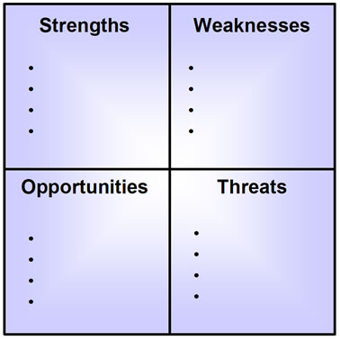 A traditional SWOT Analysis is typically used by an organisation as a strategic planning tool to assess its Strengths, Weaknesses, Opportunities and Threats. It typically involves producing a matrix of four quadrants, one each for each heading, and then listing the relevant factors for your company.