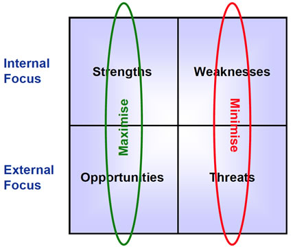 After completing your SWOT analysis, it can be very valuable to apply a “vertical focus” to create two lists of action items – “MAX” activities (to maximise Strengths & Opportunities) and “MIN” activities (to minimise Weaknesses & Threats).