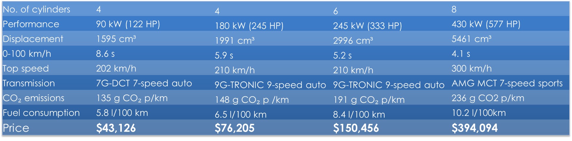 If I provide the following spec sheet, there will be a different group of people who don’t know the Mercedes range, but will understand the differences between the cars based on the technical specifications. And of course, there will be those who don’t.